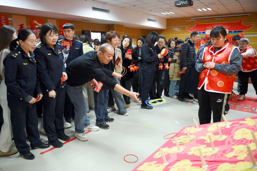 活动包含非遗文化体验、趣味游戏互动等项目内容,现场洋溢着浓浓的年味与欢声笑语。墨香四溢的“写春联”区域,书法爱好者们挥毫泼墨,一幅幅饱含祝福的春联和“福”字跃然纸上,传递着对新春的期盼和对美好生活的向往。“马上圈福”环节趣味横生,参与者手持福圈,精准投掷,寓意将好运“牢牢套住”。通过传统拓印技艺,“红包拓印”将精美的祝福语图案拓印在特制红包上,制作出独一无二的新春祝福。在非遗剪纸区,一张张红纸在体验者的巧手翻飞间变为栩栩如生的窗花,展现了非遗文化的独特魅力。
